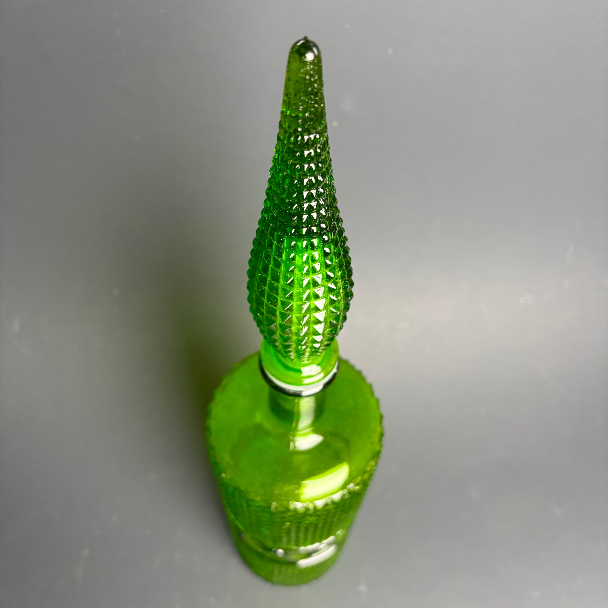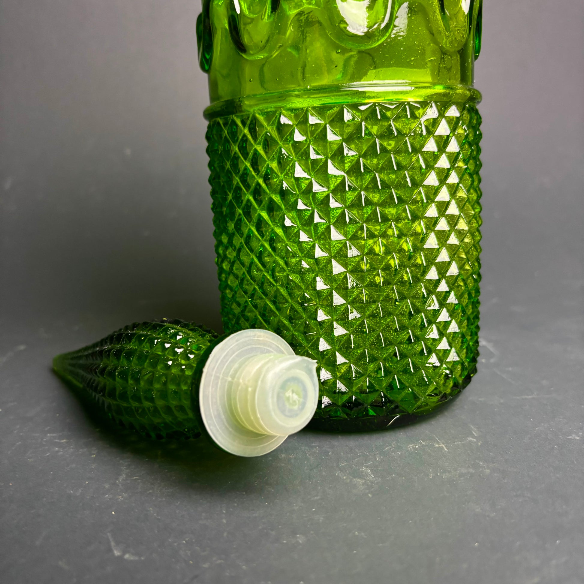 Vintage Green Empoli Style Glass Decanter with Stopper – Diamond Point & Wave Band