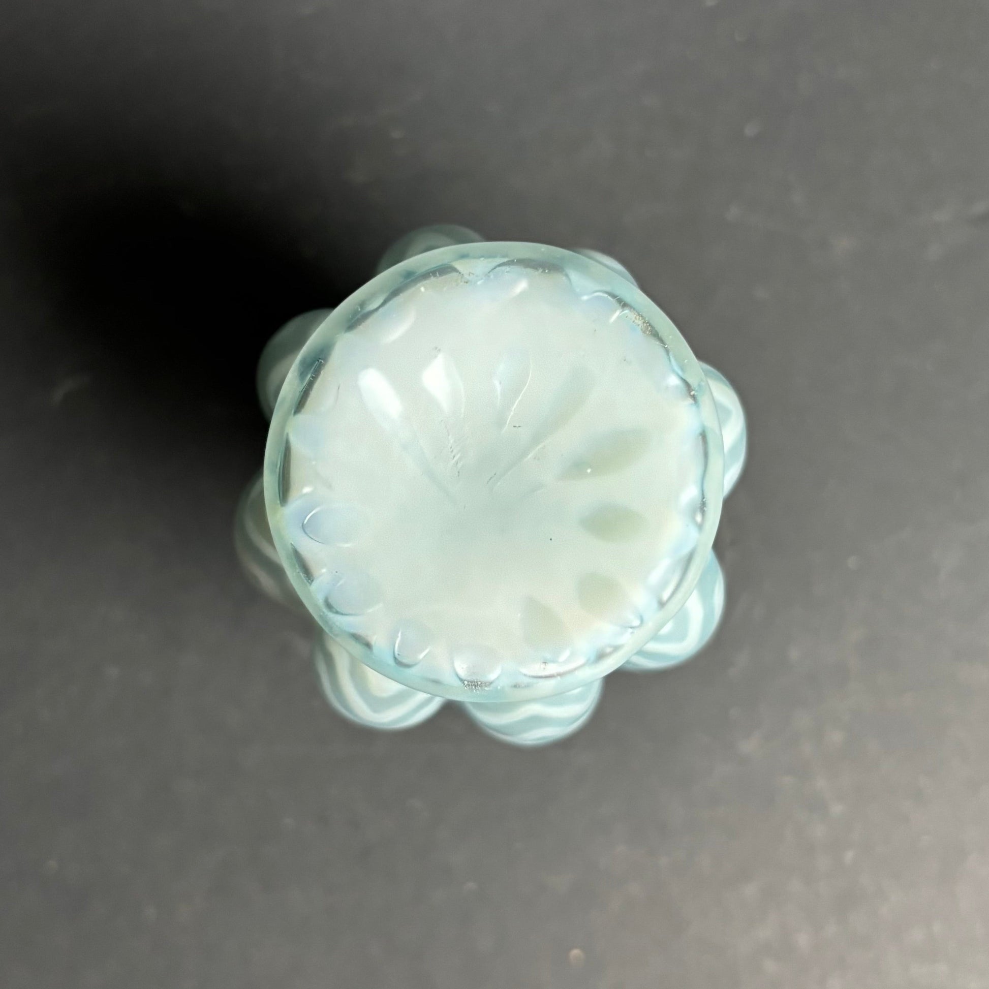 A striking mid-century art glass vase featuring a layered blue over white cased construction with a flowing feathered pattern created in the molten glass.