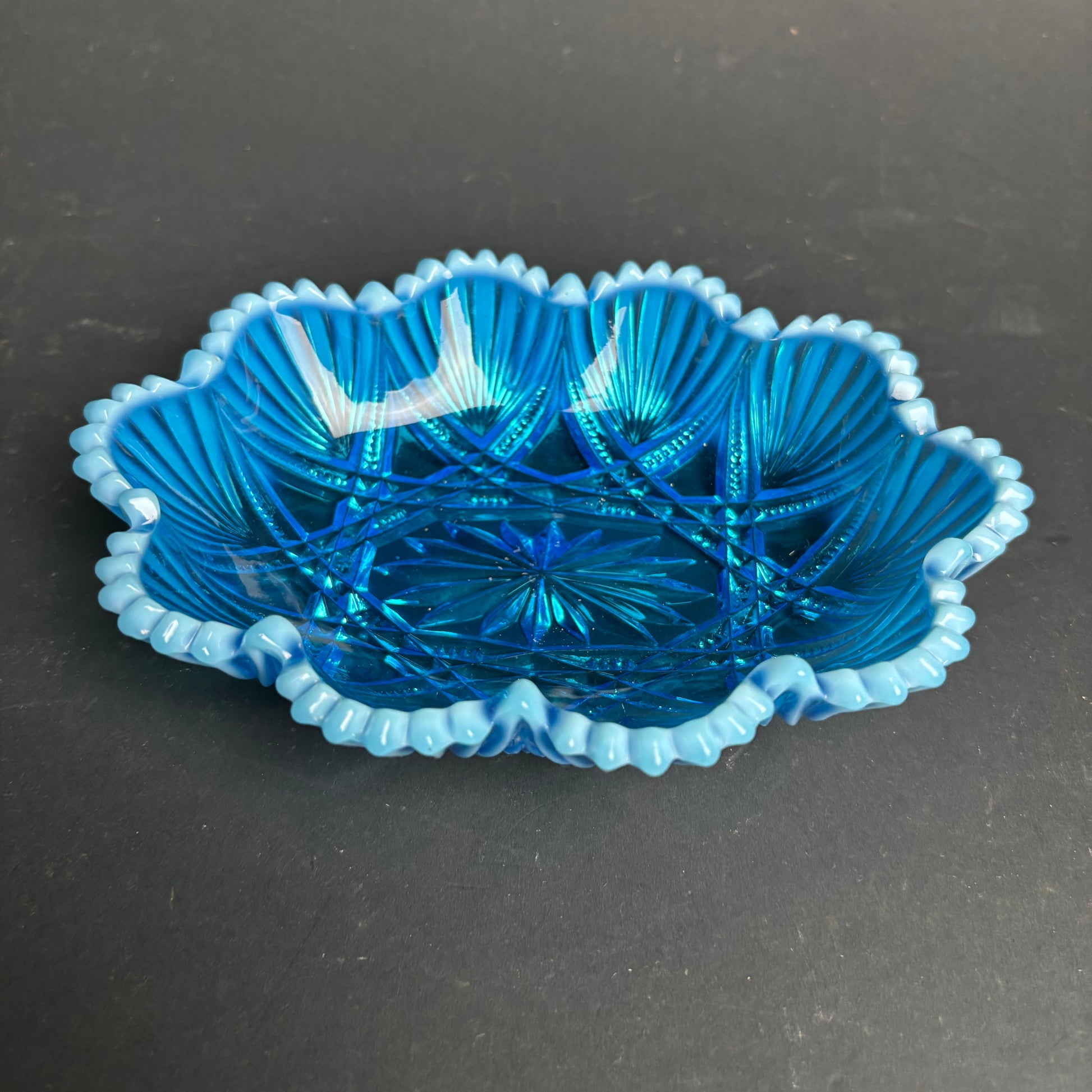 Beautiful small pressed glass dish in vivid blue with an applied milk glass crimped rim. Features a detailed starburst and fan-cut style pattern that catches the light beautifully.