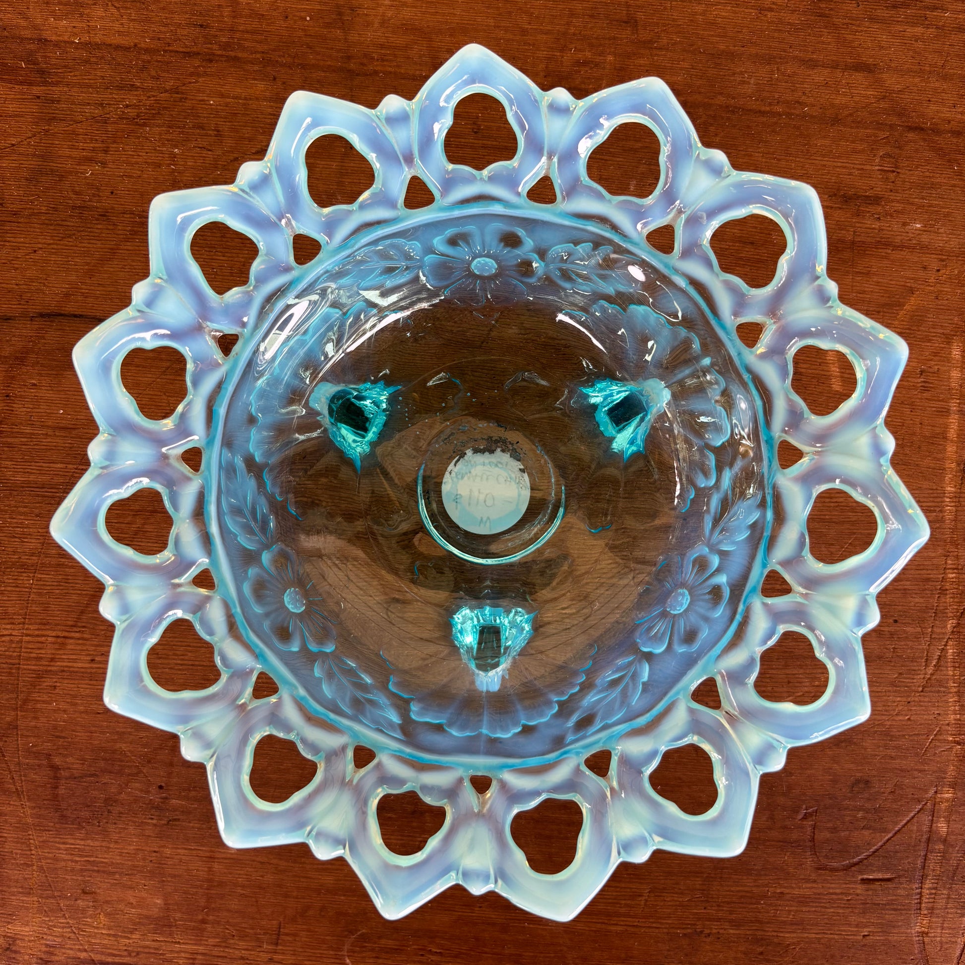 This striking vintage glass bowl features vivid aqua blue colouring that fades to a soft opalescent rim. The pierced lattice-style edge and floral-pressed base add beautiful period detail. Set on three small glass feet, it lifts slightly from the surface, enhancing the light play through the glass.