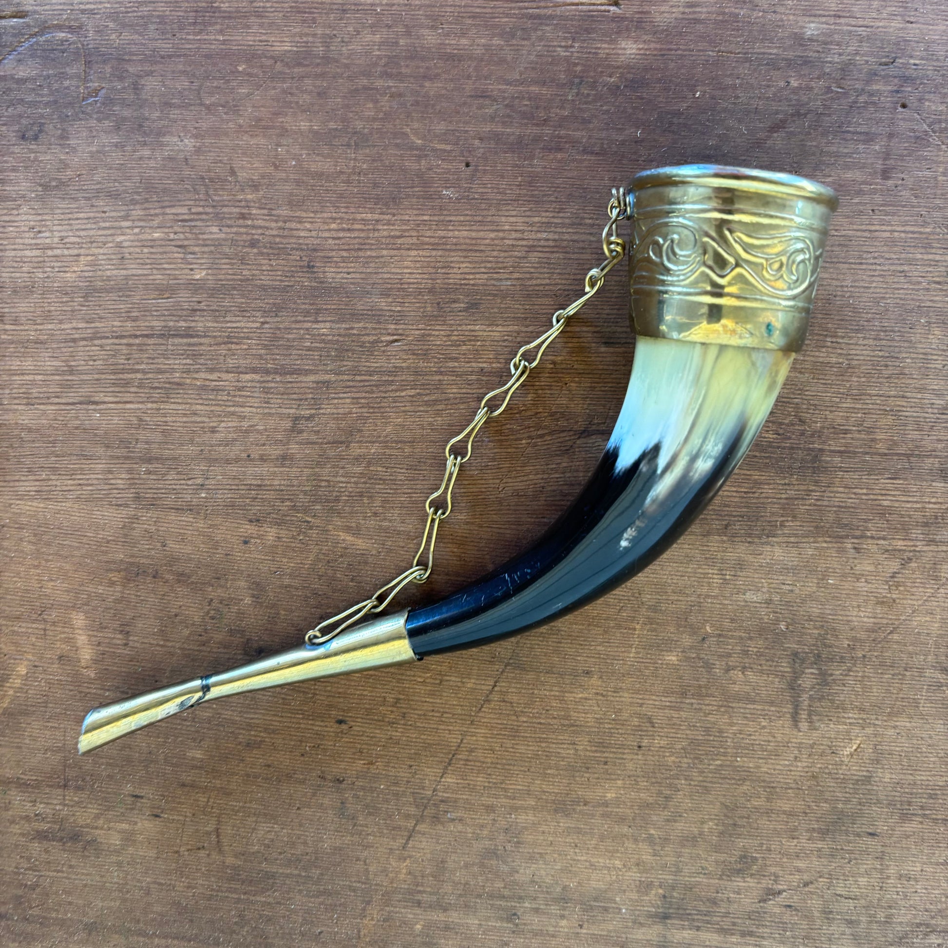 A striking vintage drinking horn formed from natural bovine horn and finished with decorative brass mounts and safety chain.