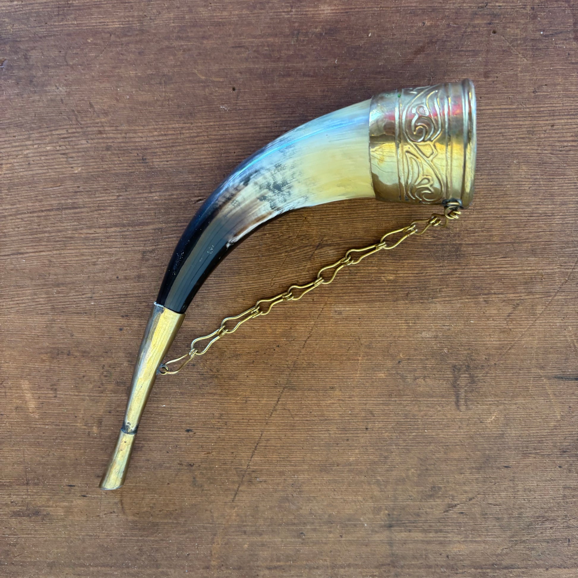 Vintage Brass-Mounted Drinking Horn with Chain