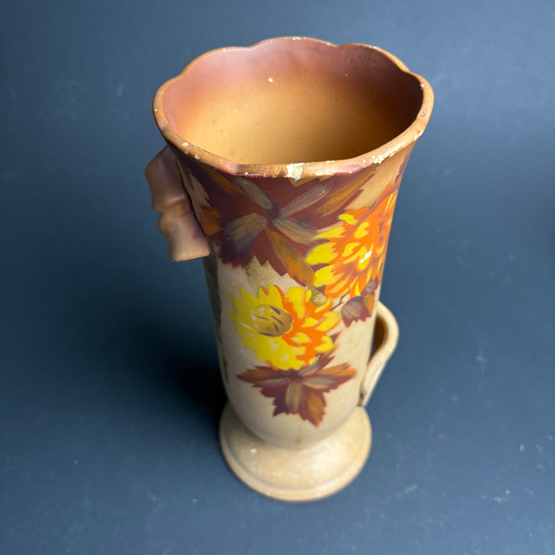 Tall vintage English pottery vase with hand-painted floral decoration in warm ochre, orange and brown tones over a speckled satin glaze.