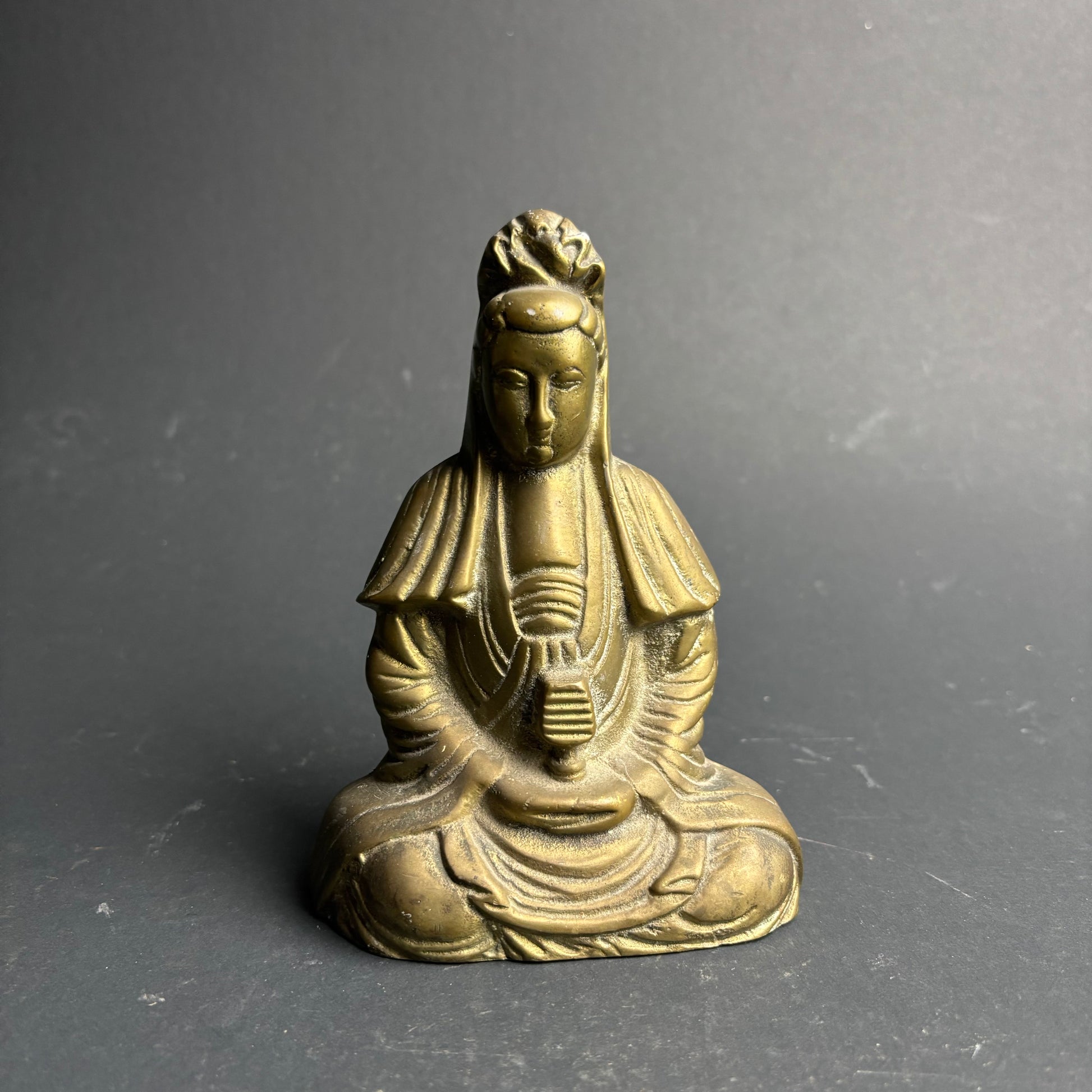 Vintage Cast Metal Seated Guanyin Figure – Brass Tone Buddhist Sculpture