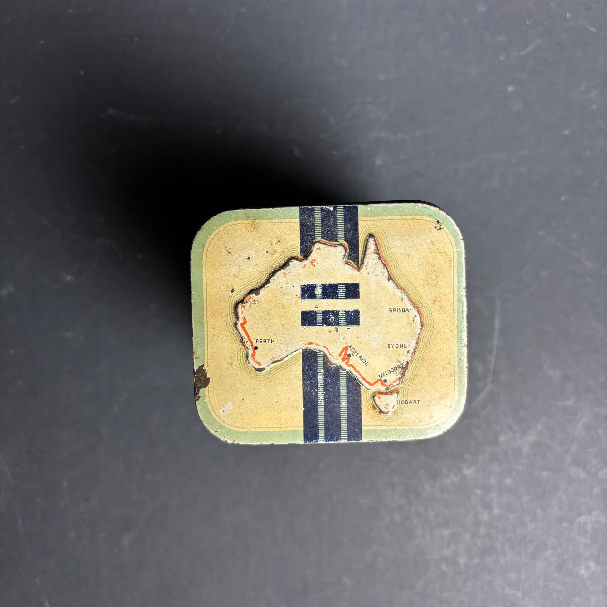 - Lid with stylised map of Australia featuring major cities