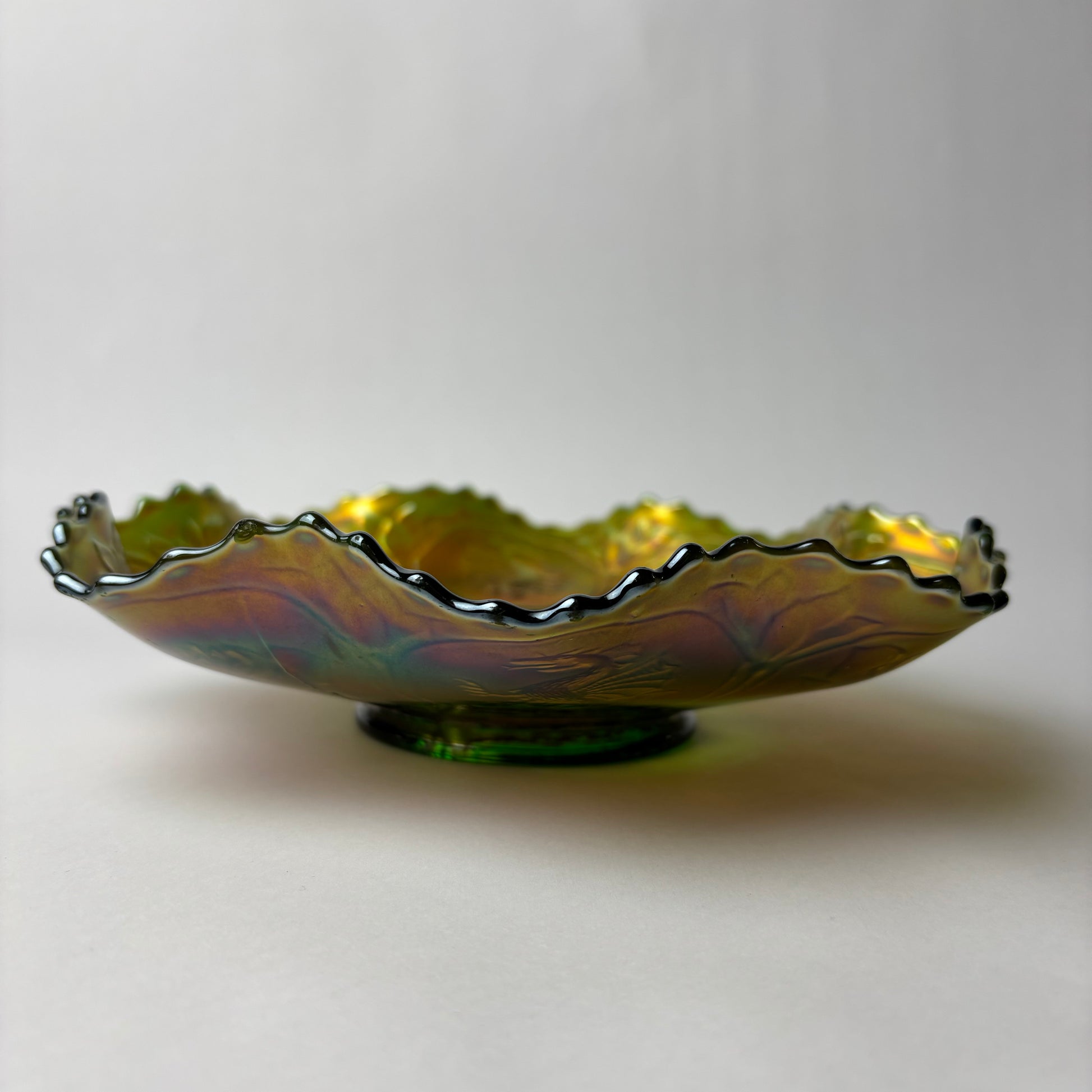 A classic piece of American carnival glass, this pressed bowl features the well-known “Dragon & Lotus” pattern by Fenton Art Glass. The design alternates mythical dragons with stylised lotus blossoms, highlighted by a rich marigold iridescent finish over a deep green base.