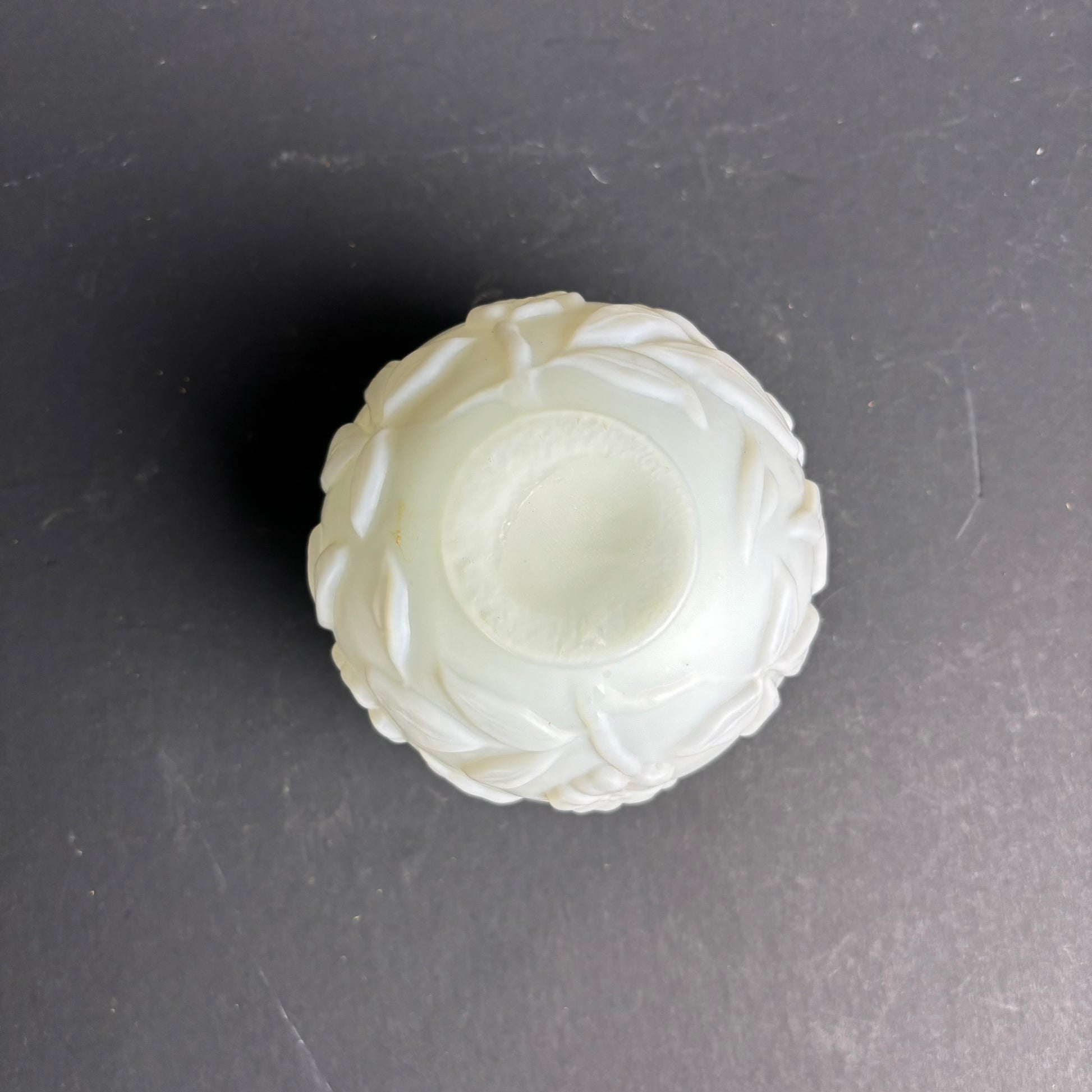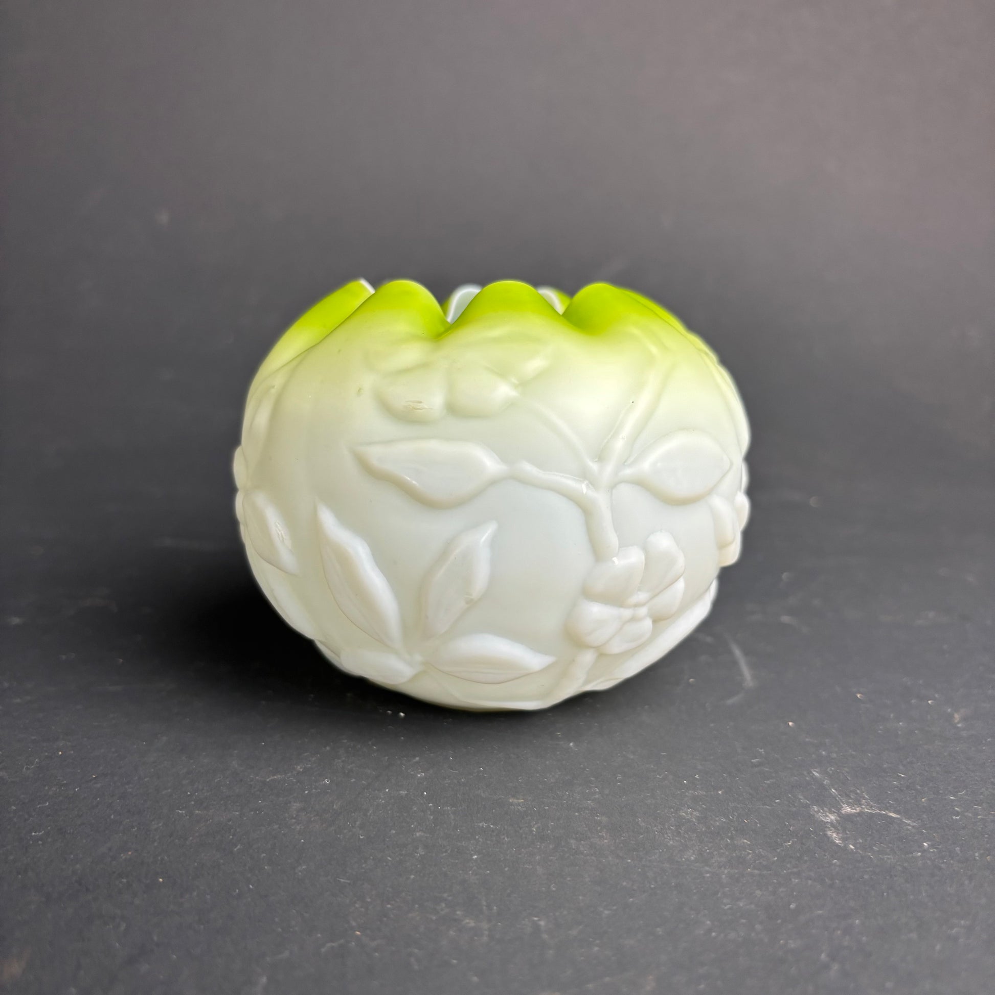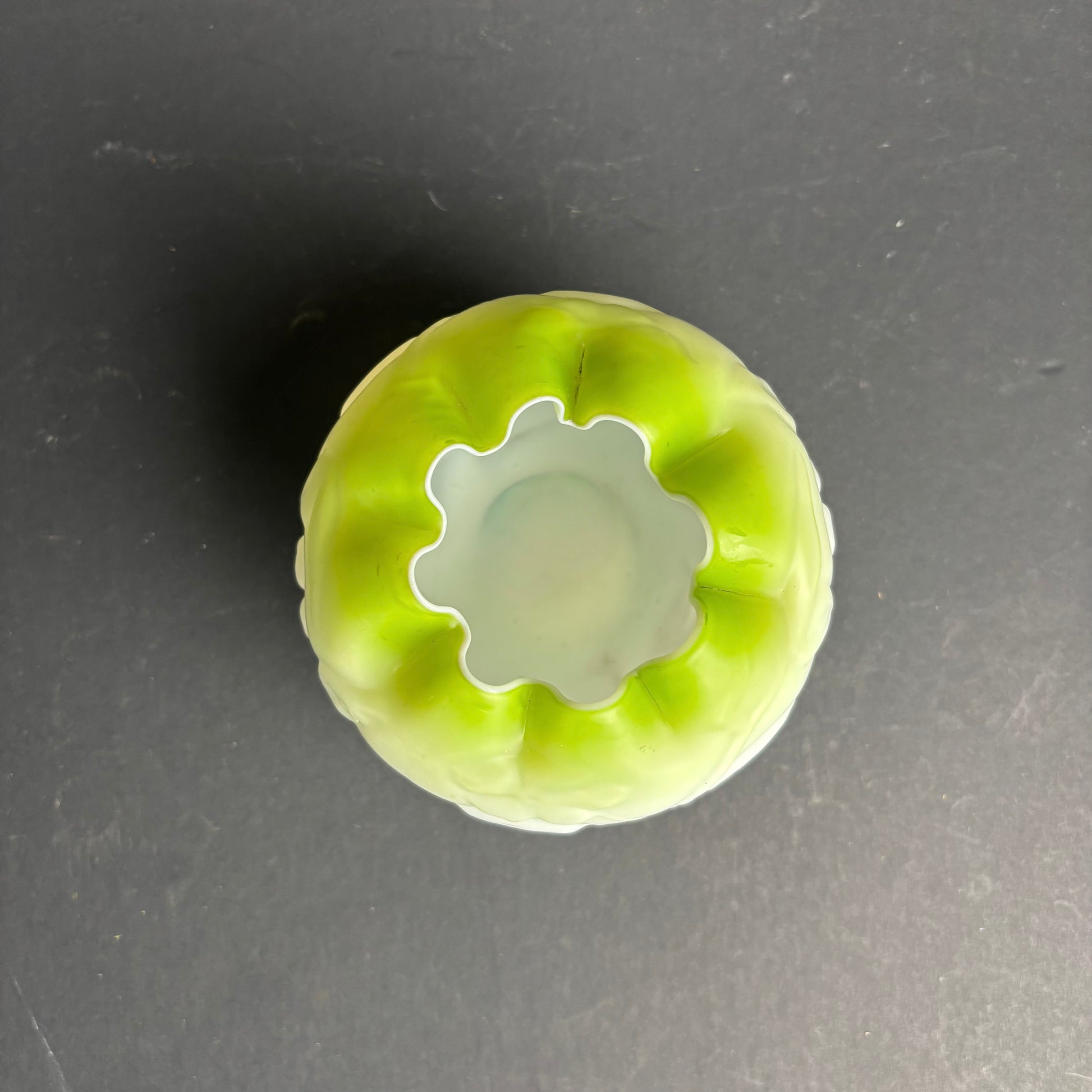 Two-layer construction with a vivid green outer casing over a satin milk glass interior. The softly crimped rim and rounded form give it a decorative, period-inspired feel, while the relief work echoes earlier Victorian floral designs.