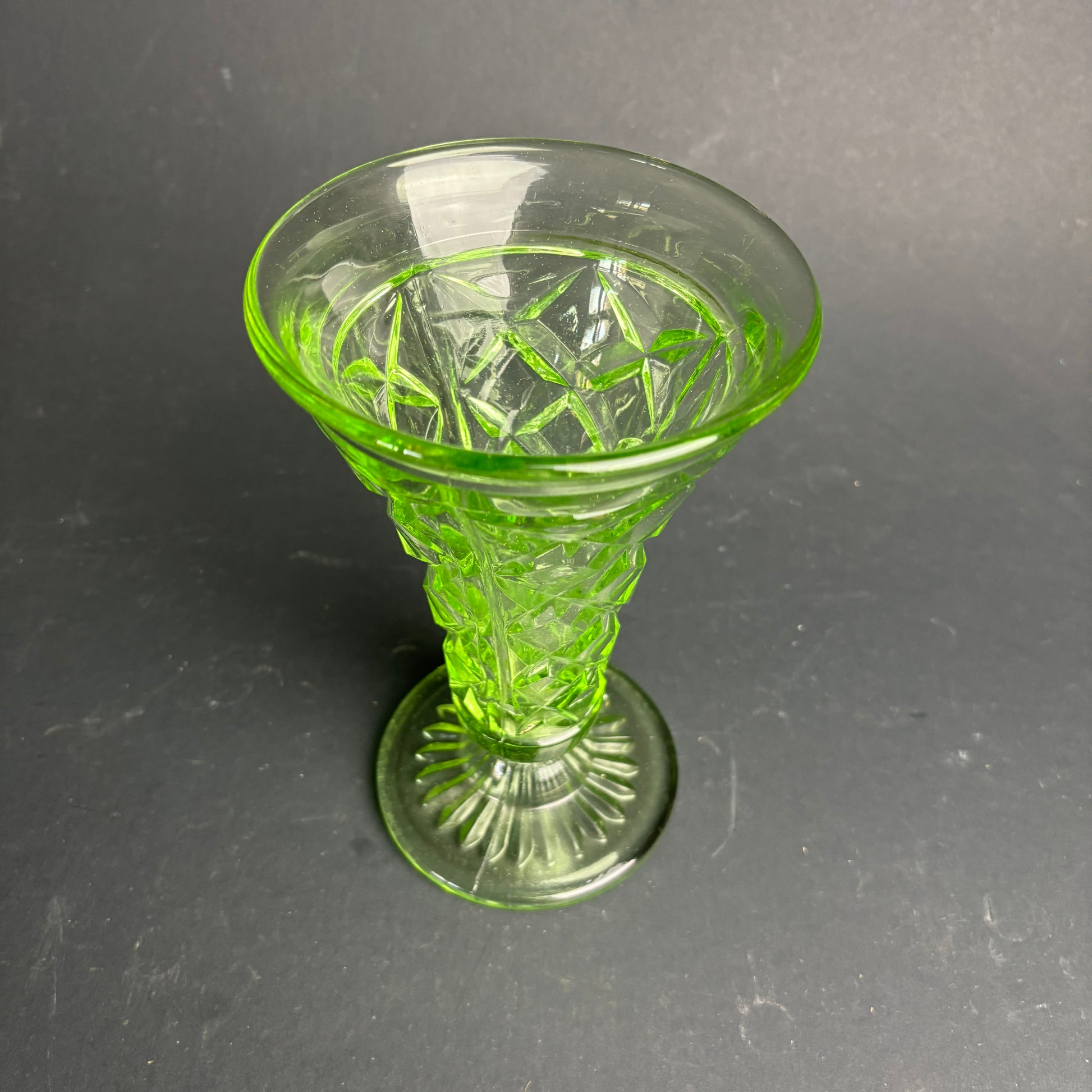 Vintage Green Pressed Glass Trumpet Vase / Posy Vase – Diamond Pattern