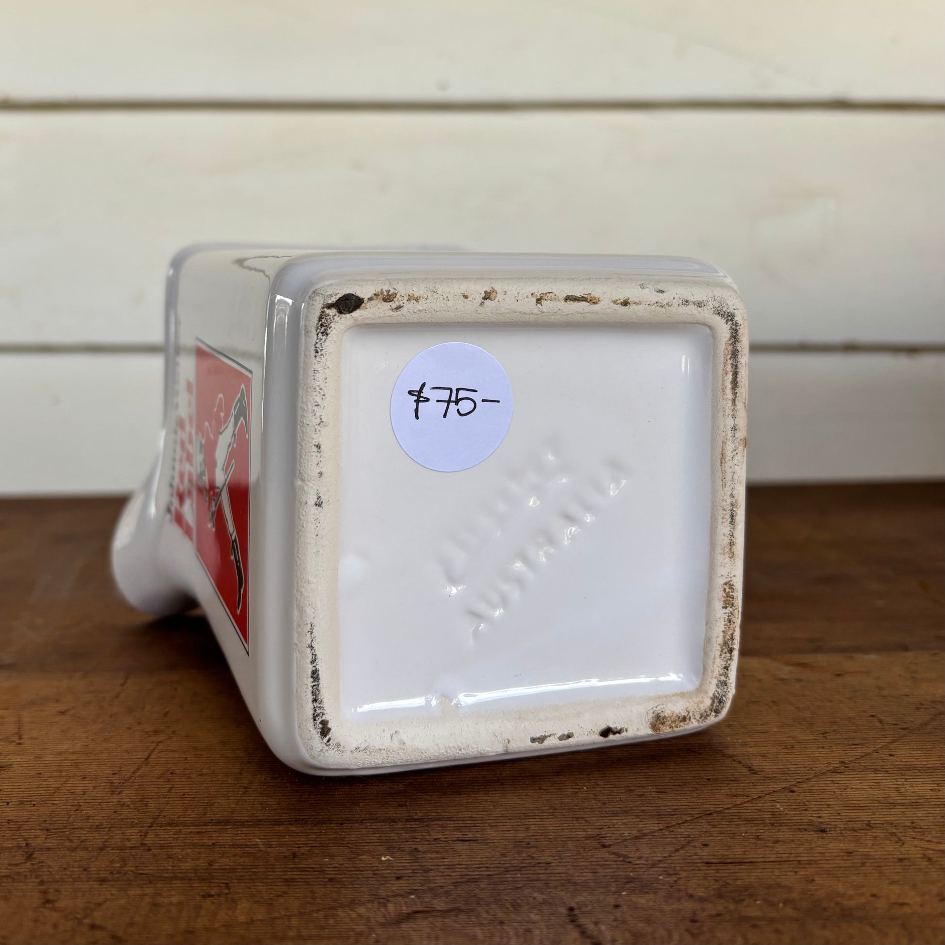 Classic Australian-made ceramic advertising jug produced for Johnnie Walker whisky. Used across pubs and bottle shops as a bar-top water pitcher, this vitrified square-form jug carries bold Red Label branding and the iconic Striding Man graphic on both sides. Highly collectable among whisky and breweriana enthusiasts for its clean typography and mid-century design presence.