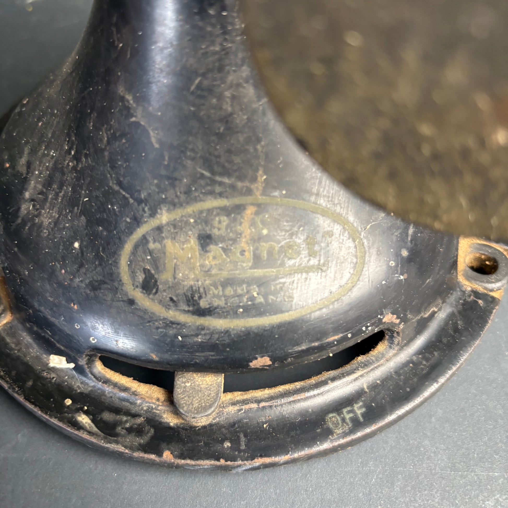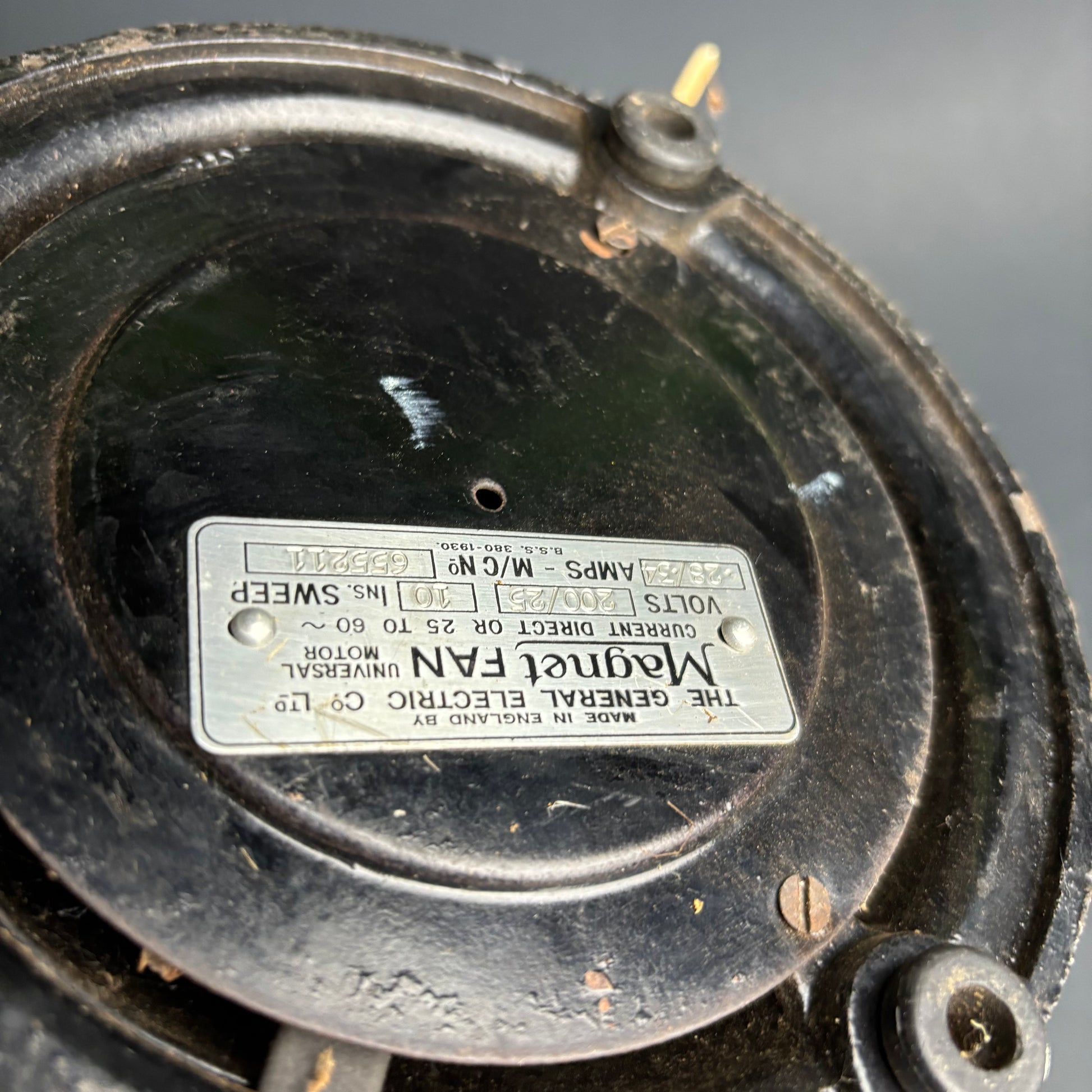 Vintage Magnet desk fan by General Electric Co Ltd (England) featuring a cast metal base and four-blade brass fan.