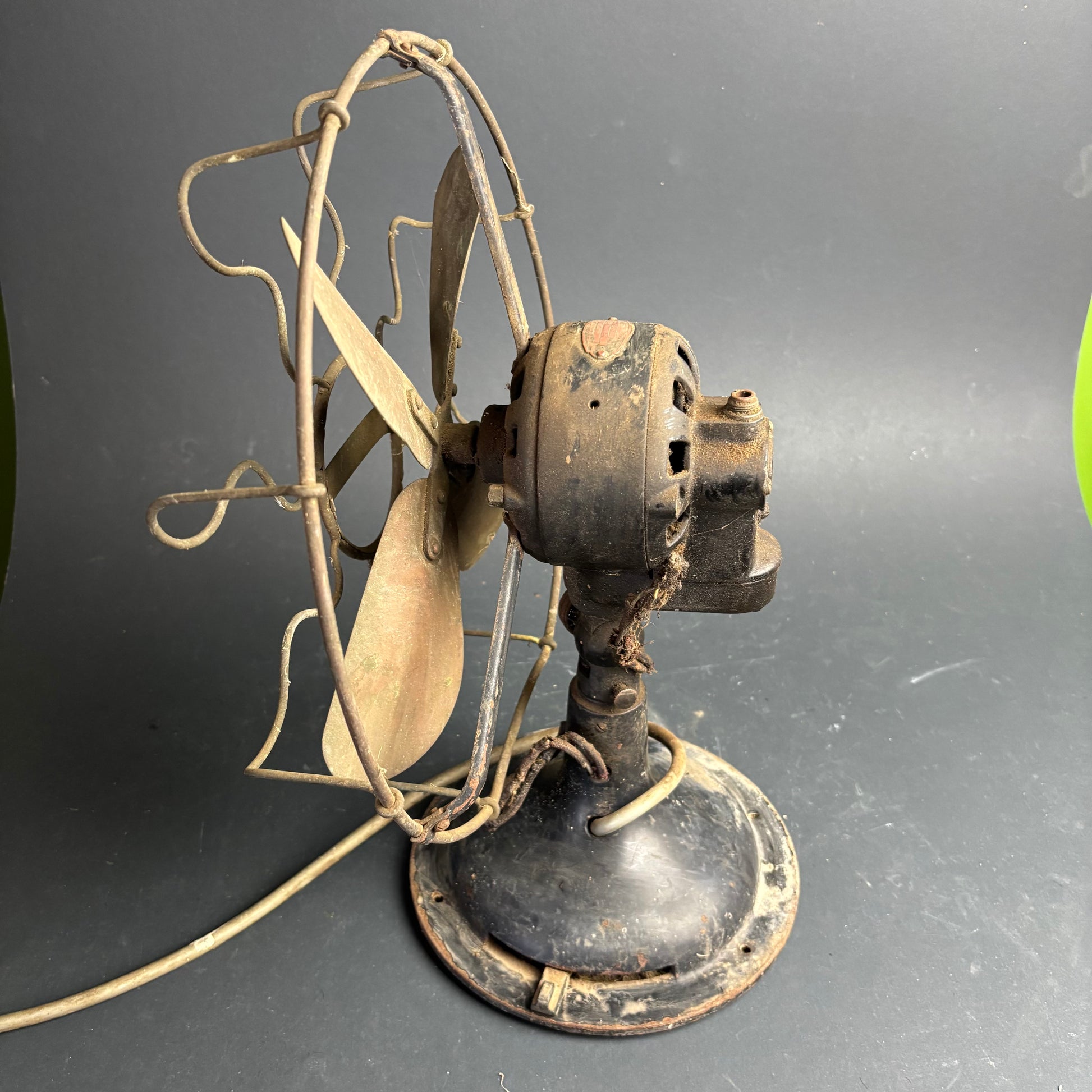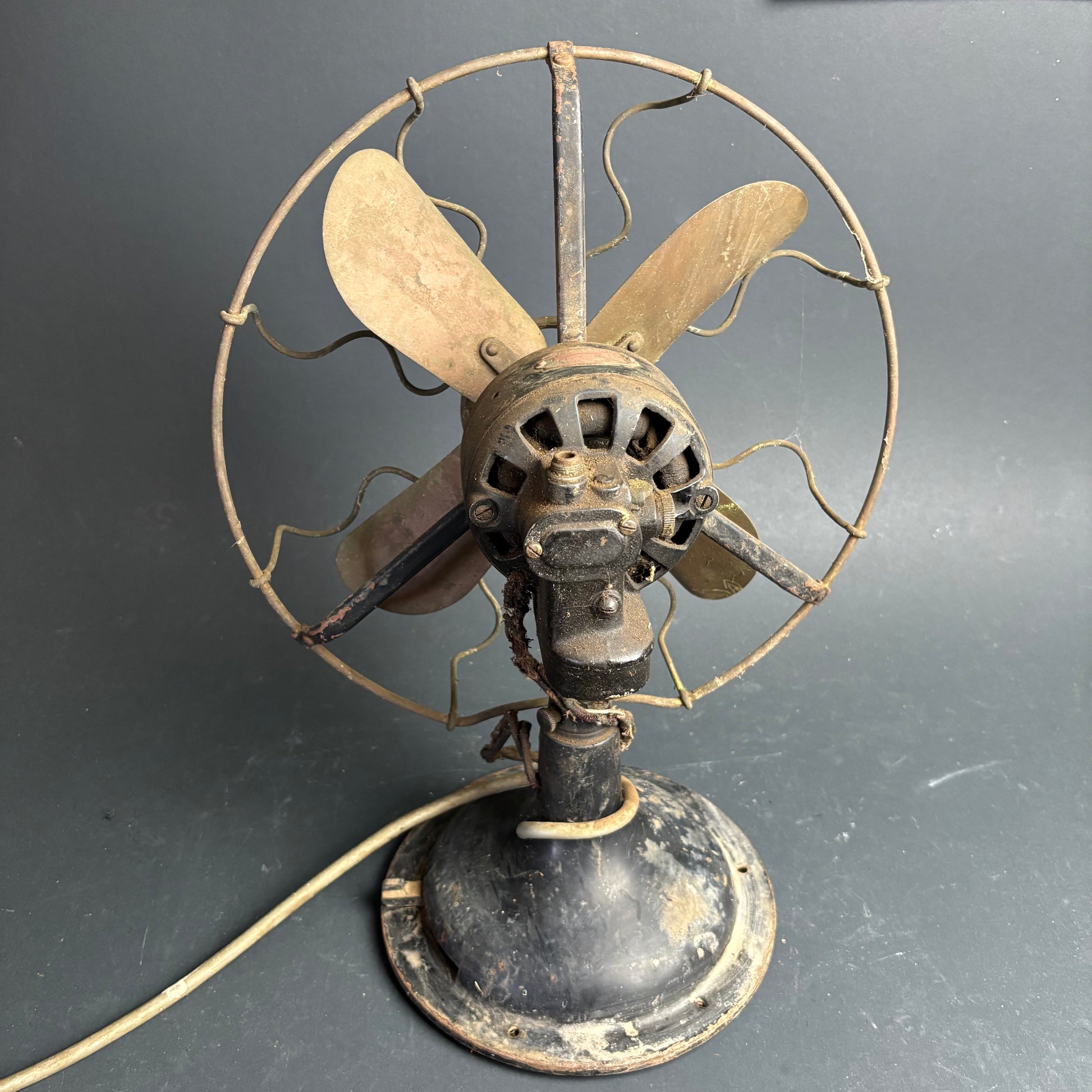 The brass blades carry a natural aged patina, and the cage has that slightly irregular hand-formed look typical of early fans.