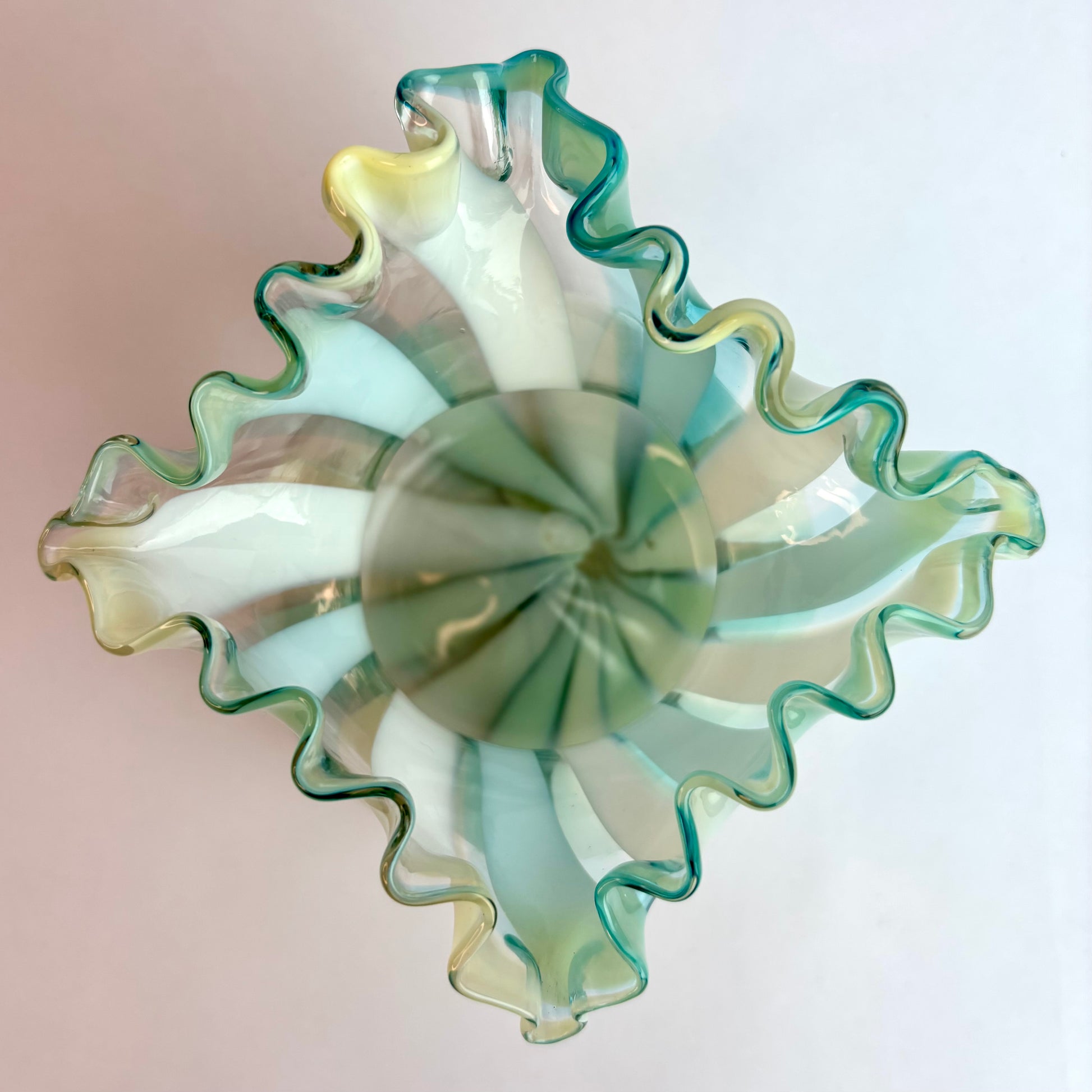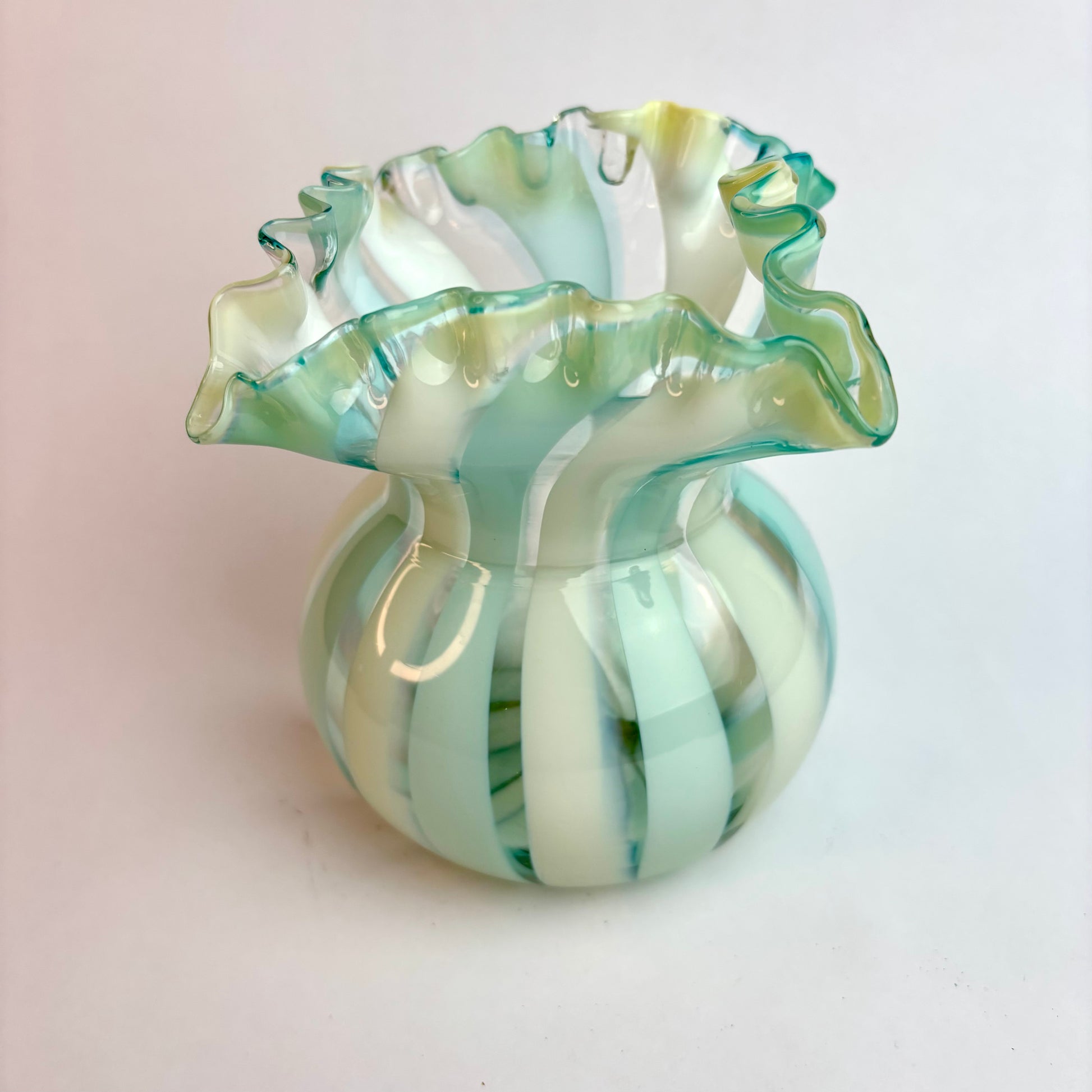 Vintage Murano Glass Vase – Opalescent Aqua & White Spiral, Uranium Glass Glow, Ruffled Rim