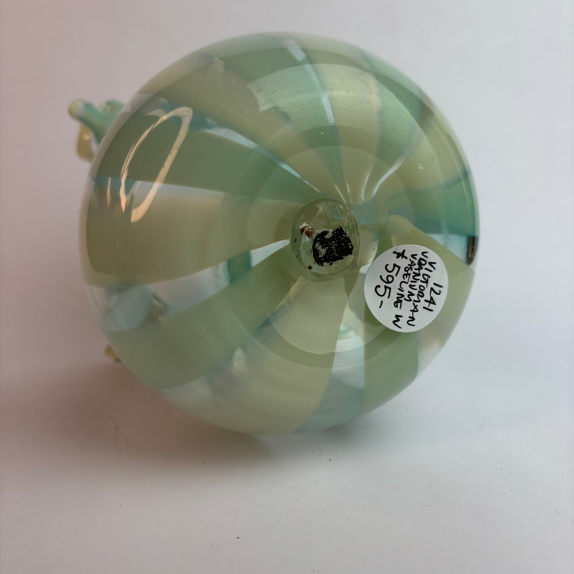 Under UV light, the upper rim and interior base exhibit a subtle uranium glass fluorescence, confirming the presence of uranium oxide in the glass batch—a traditional Murano colouring agent used to produce luminous green tones. This adds both collector appeal and authenticity.
