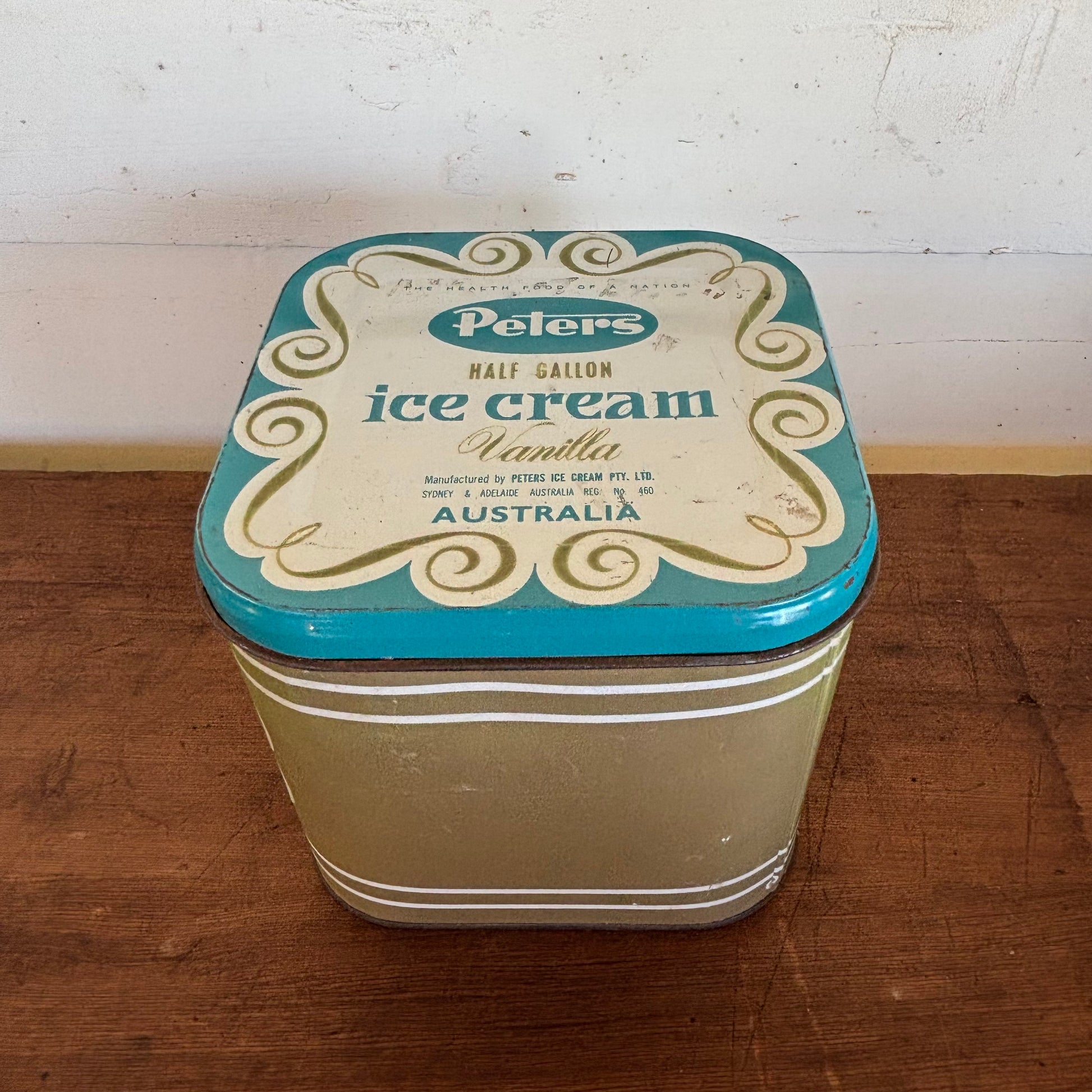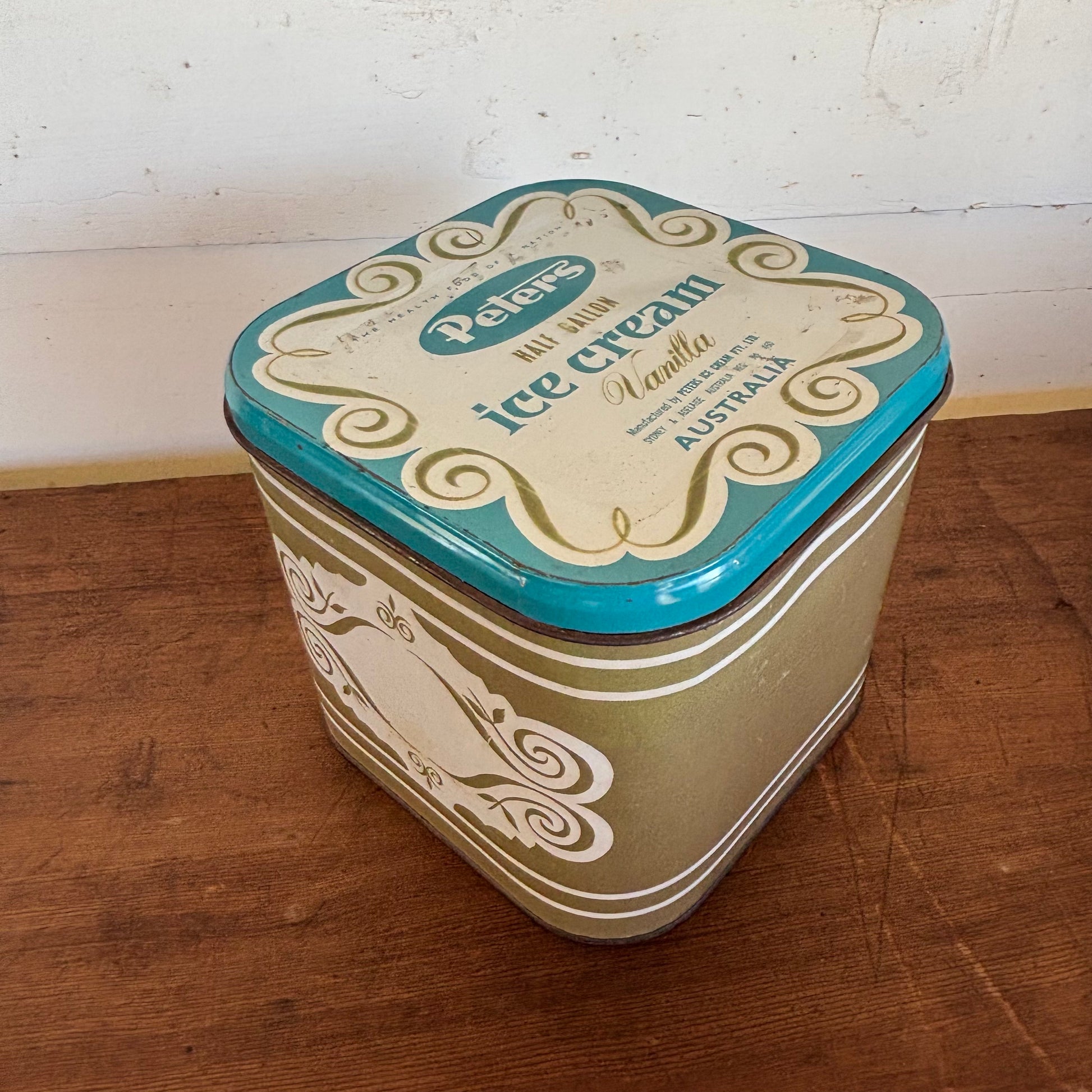 Classic Australian Peters Ice Cream tin — square half-gallon size with teal and cream scroll design and “The Health Food of a Nation” slogan.
