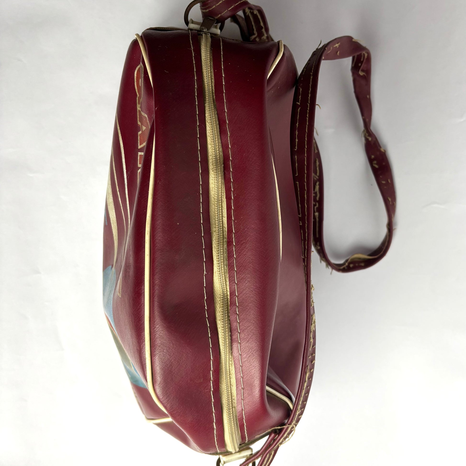 Deep burgundy with cream piping and retro gold, red, and blue graphics – including the iconic Qantas tail fin design. A great collector’s piece for aviation enthusiasts or mid-century design lovers.