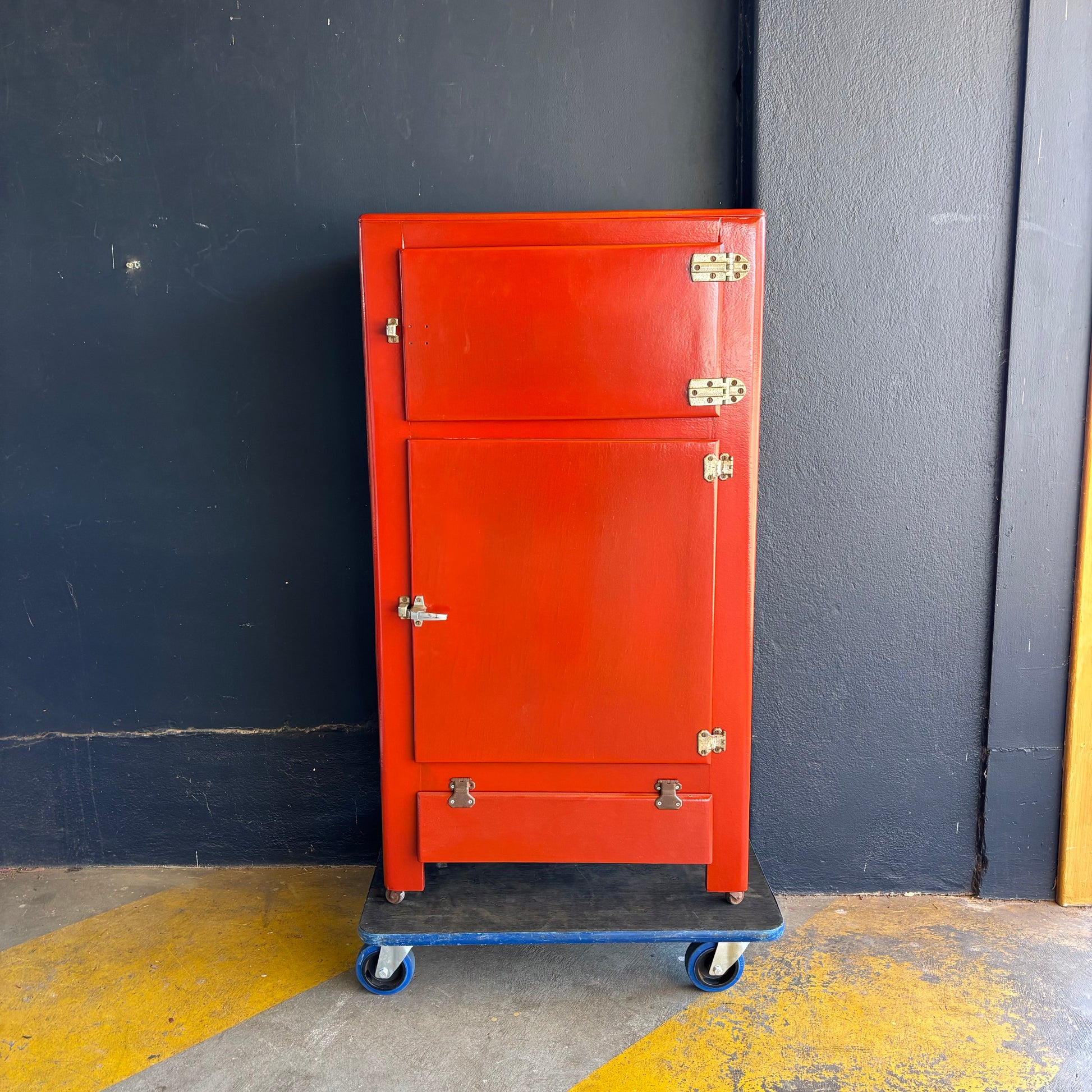 A striking original vintage ice chest–style cabinet, finished in bold red with cream interior panels and solid utilitarian hardware.