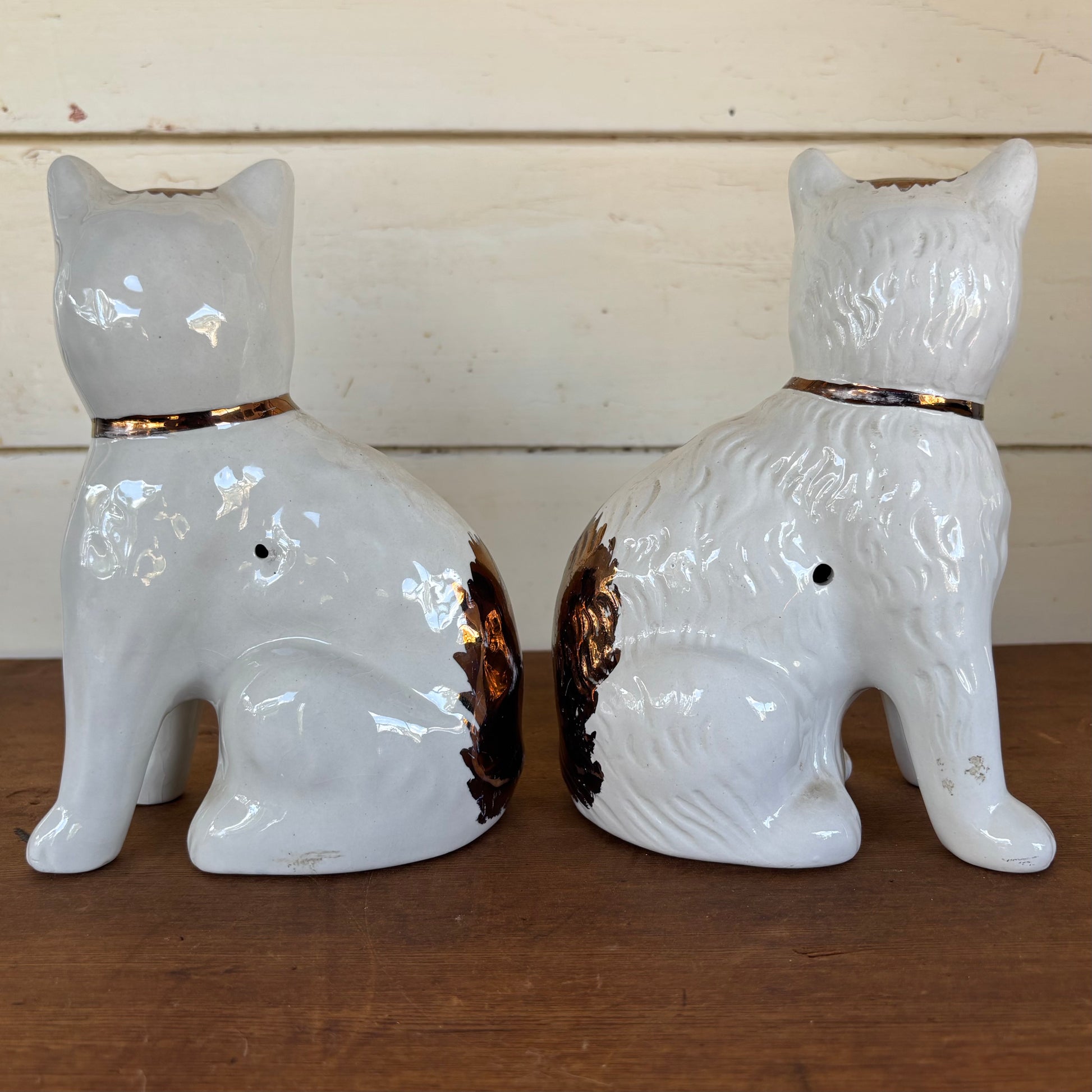 A charming matched pair of vintage Staffordshire-style pottery cats, finished with warm copper lustre detailing and expressive hand-painted faces.