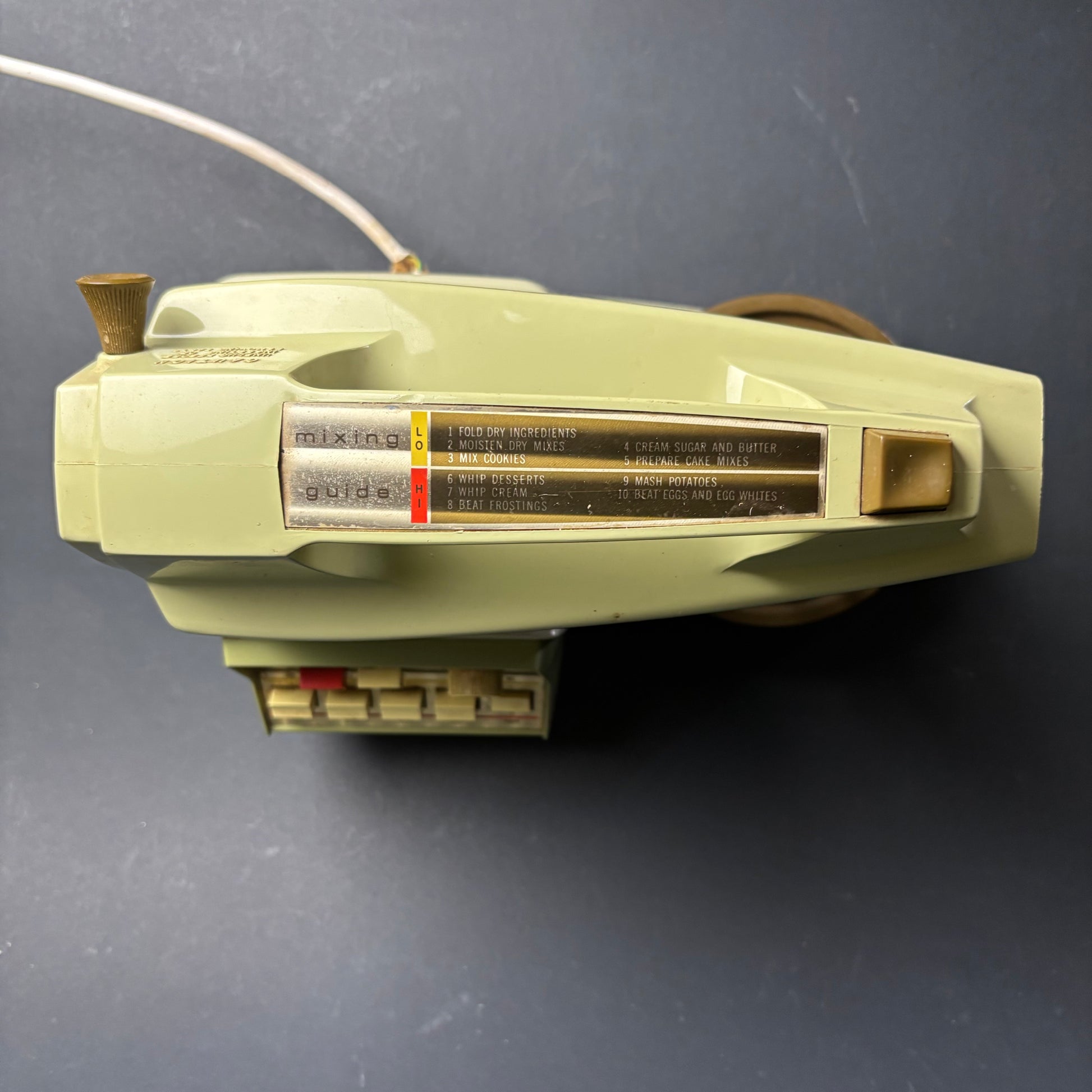 A great slice of 1970s kitchen design—chunkier, more futuristic styling compared to earlier Mixmasters, with push-button functions and speed dial control. The control panel with labelled functions (stir, whip, mix etc.) is a standout detail.