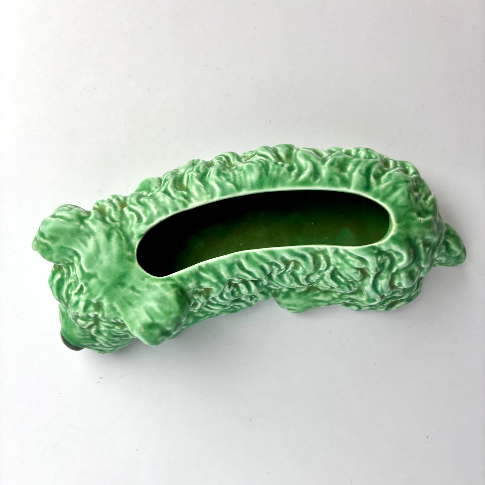 A classic Sylvac dog trough vase, model 2024, produced in Stoke-on-Trent and dating to the firm’s highly collectable interwar period. Modelled as a reclining terrier with head resting on its paws, the elongated body forms a planter or spill vase cavity along the back.