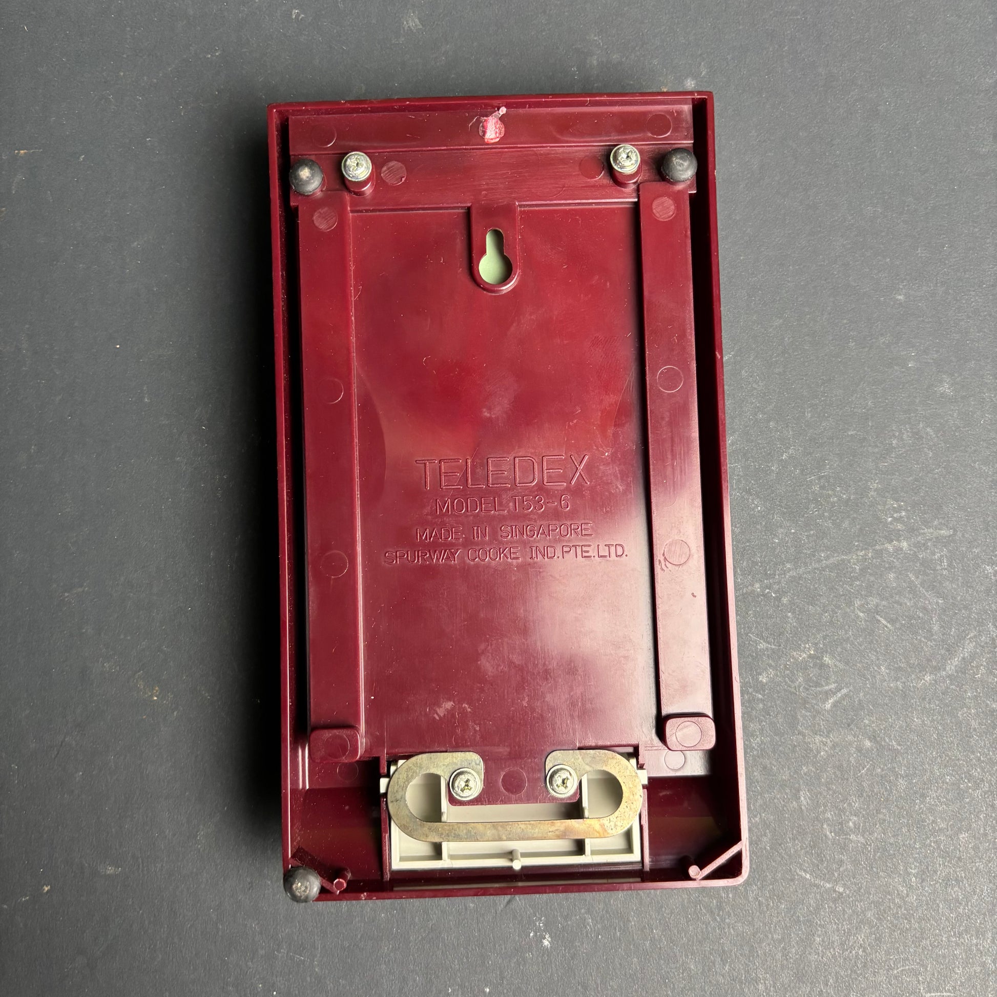 A classic mid-century desk accessory, this Teledex address index features a rich burgundy case with contrasting cream controls and original index cards.