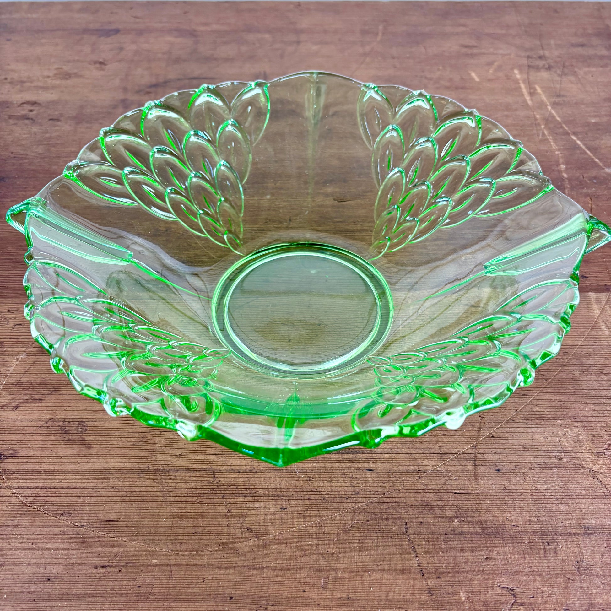 A striking Depression-era uranium glass bowl, beautifully moulded with stylised Art Deco leaf motifs. An excellent display or serving piece, it fluoresces with vivid electric green under black light – a standout for collectors of vintage glass and lovers of unique decorative objects.